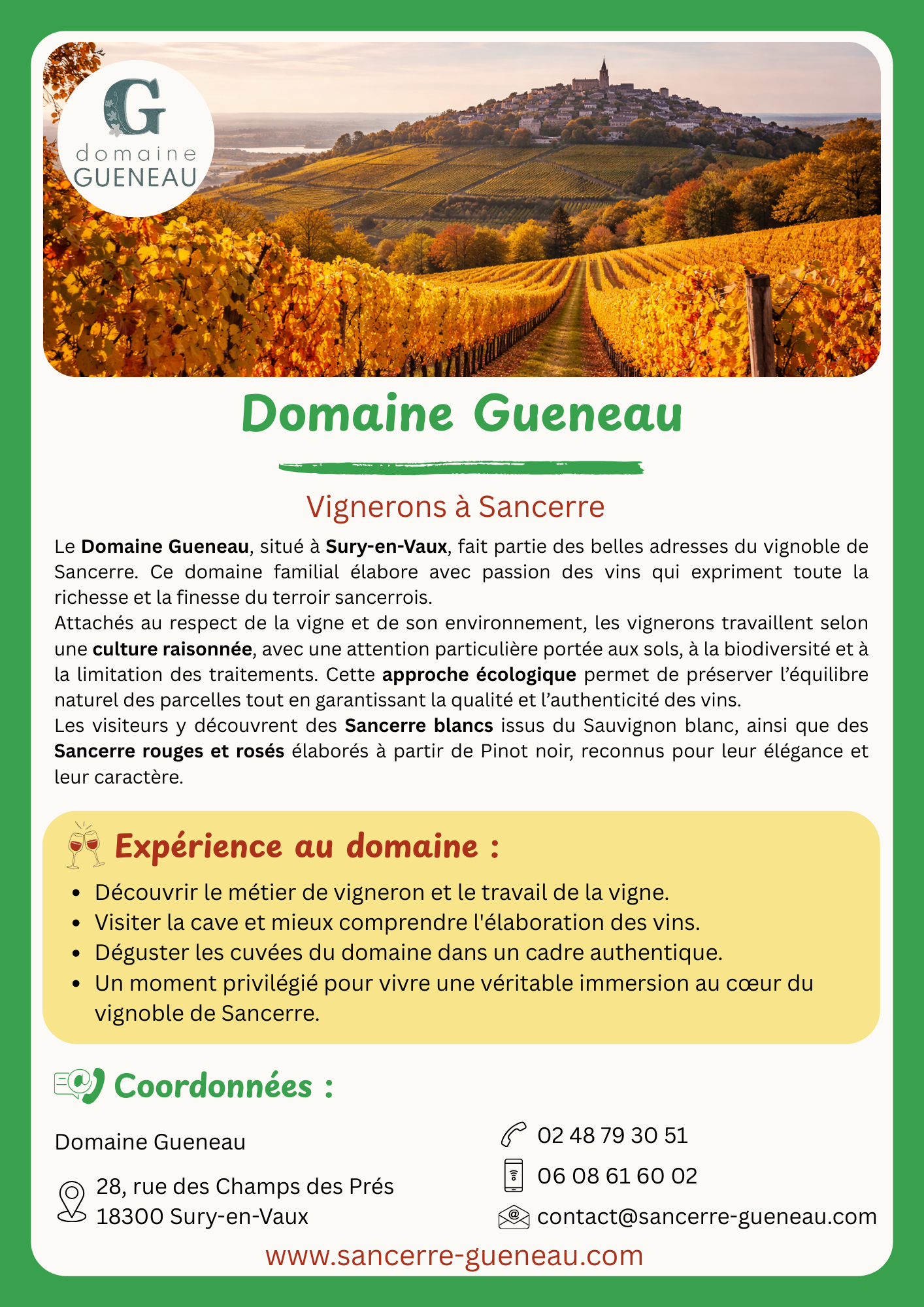 Grâce à notre connaissance du territoire, nous facilitons la découverte du vignoble de Sancerre en mettant les voyageurs en relation avec des vignerons et domaines que nous aimons recommander. Ces professionnels passionnés accueillent les visiteurs au sein de leur domaine pour leur faire découvrir leurs vins, partager leur savoir-faire et proposer des visites de cave et dégustations dans un cadre authentique.
